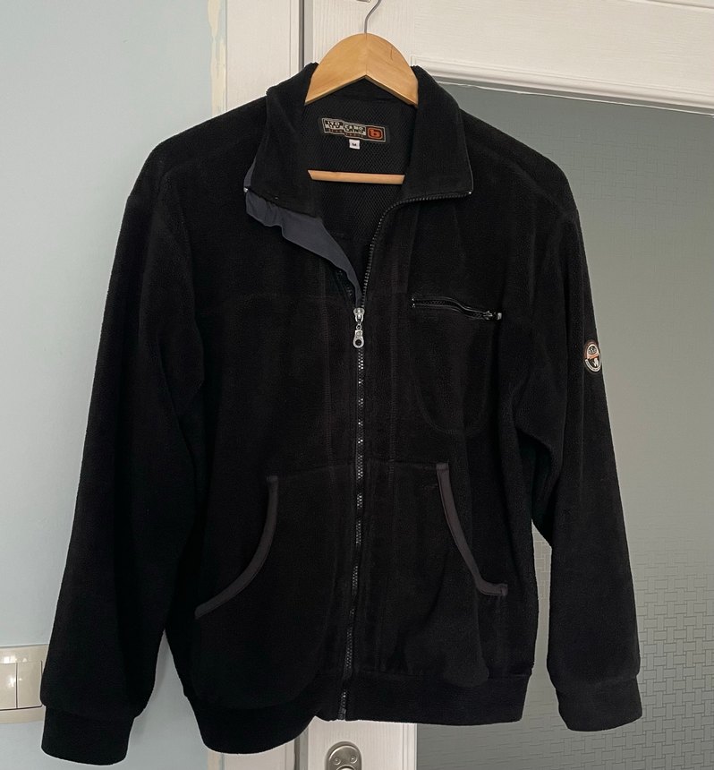 Siyah erkek polar mont boyu 67 cm Fermuarlı ön ve ceplidir, günlük sokak giyimine uygundur.