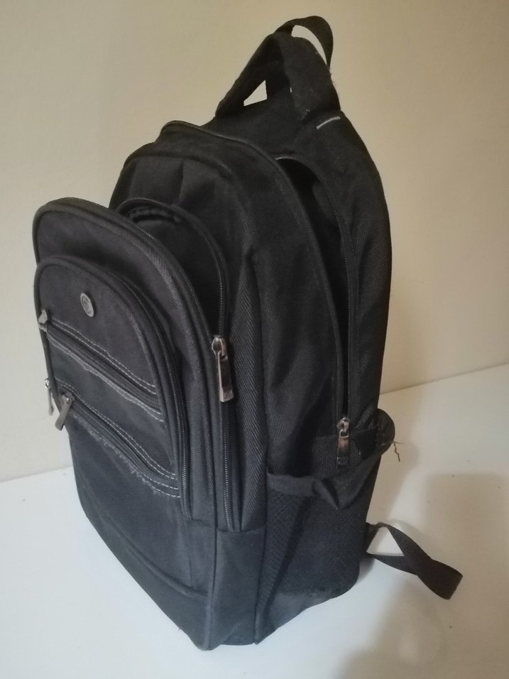 Bu erkek sırt çantası, çoklu fermuarlı bölmeler ve düz siyah tasarımı ile iş ve günlük kullanım için uygundur.