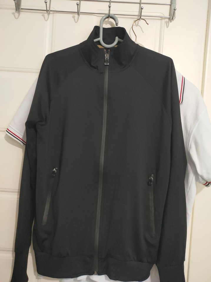 Siyah, fermuarlı cepleri olan, yüksek yakalı ve uzun kollu erkek spor ceket. Pürüzsüz sentetik kumaştan, günlük kullanıma uygun.