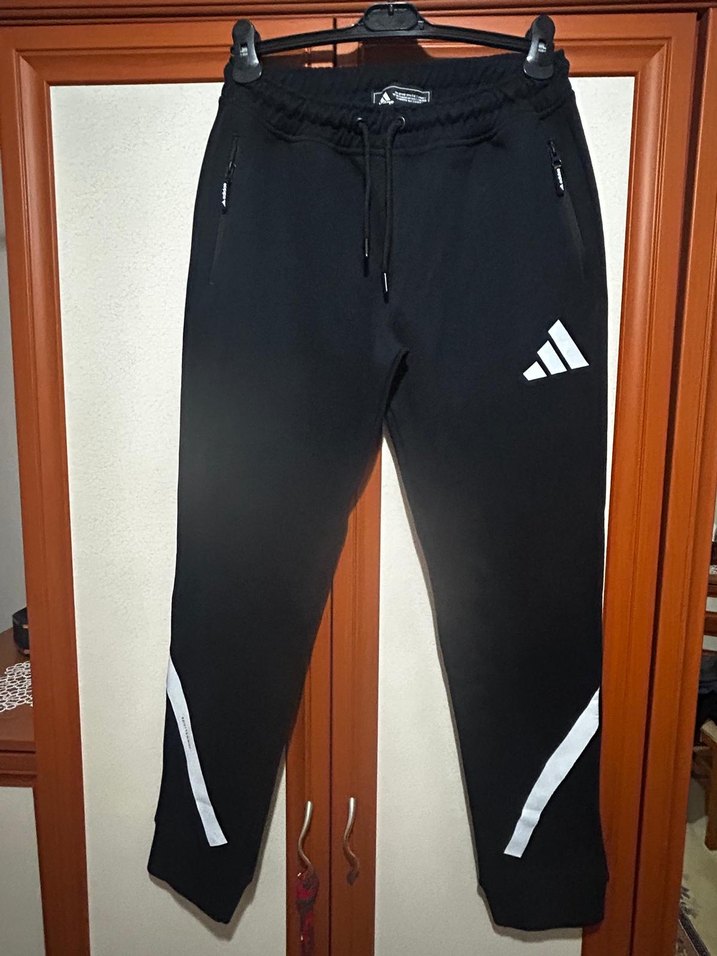 Siyah, baskılı ve fermuarlı cepleri olan, sentetik kumaştan üretilmiş, spor ve şık görünümlü erkek eşofman altı.
