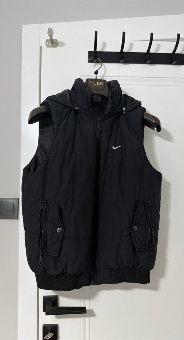Siyah, yüksek yakalı, fermuarlı ve cep detaylı erkek yelek. Yumuşak ve sıcak kumaştan, günlük kullanıma uygun.