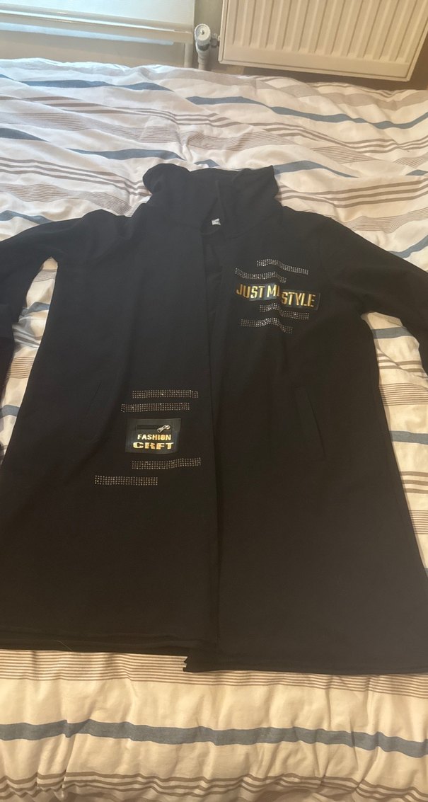 Siyah renkli, fermuarlı ve yüksek yakalı erkek ceket. Uzun kollu, bol kesim ve midi boyda, baskılı detaylarla günlük sokak stili için uygun.