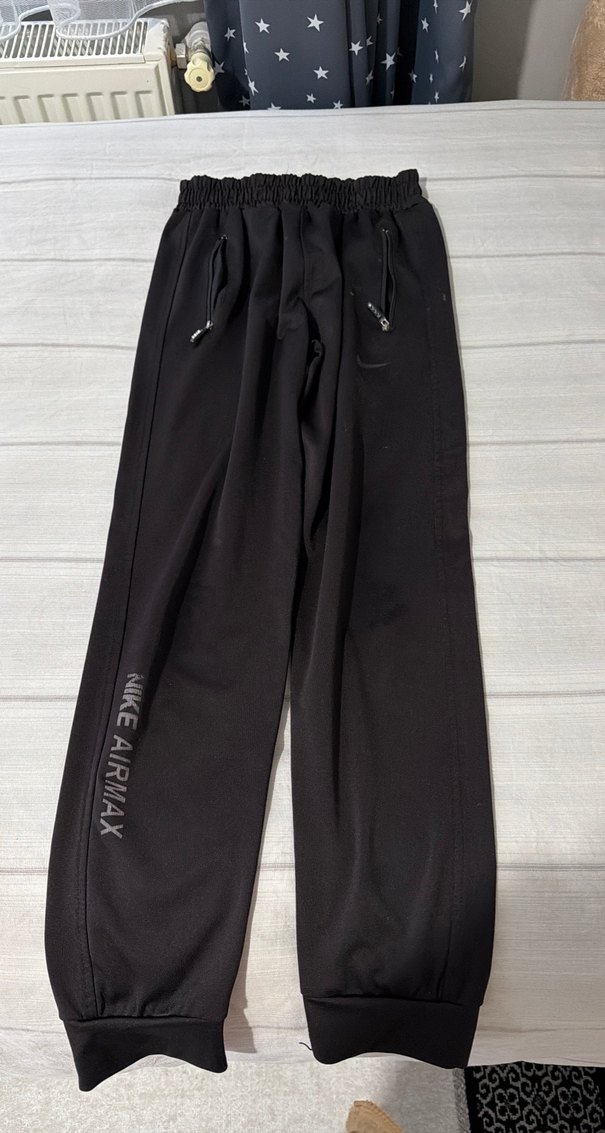 Siyah, bol kesim, fermuarlı cepli, sentetik kumaştan erkek sweatpants. "NIKEAIRMAX" baskılı, spor ve günlük kullanım için uygundur. ♂️