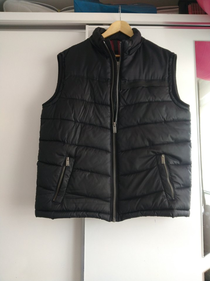 Siyah renkli, fermuarlı, yüksek yakalı ve kolsuz erkek yeleği. Minimalist tarzda, normal boyda ve günlük kullanıma uygun.