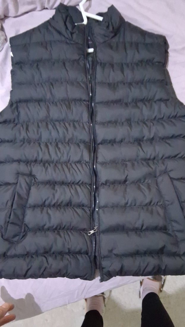 Fermuarlı, kolsuz, yüksek yakalı siyah yelek. Sentetik kumaştan, günlük kullanım için uygun, rahat bir sokak tarzı ürünü.