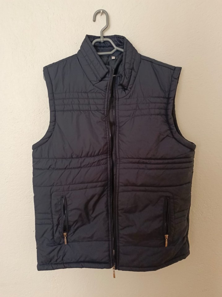 Siyah, fermuarlı ve yakalı, kolsuz erkek yelek. Sentetik kumaştan üretilmiş, normal kesim ve günlük rahat kullanıma uygun.