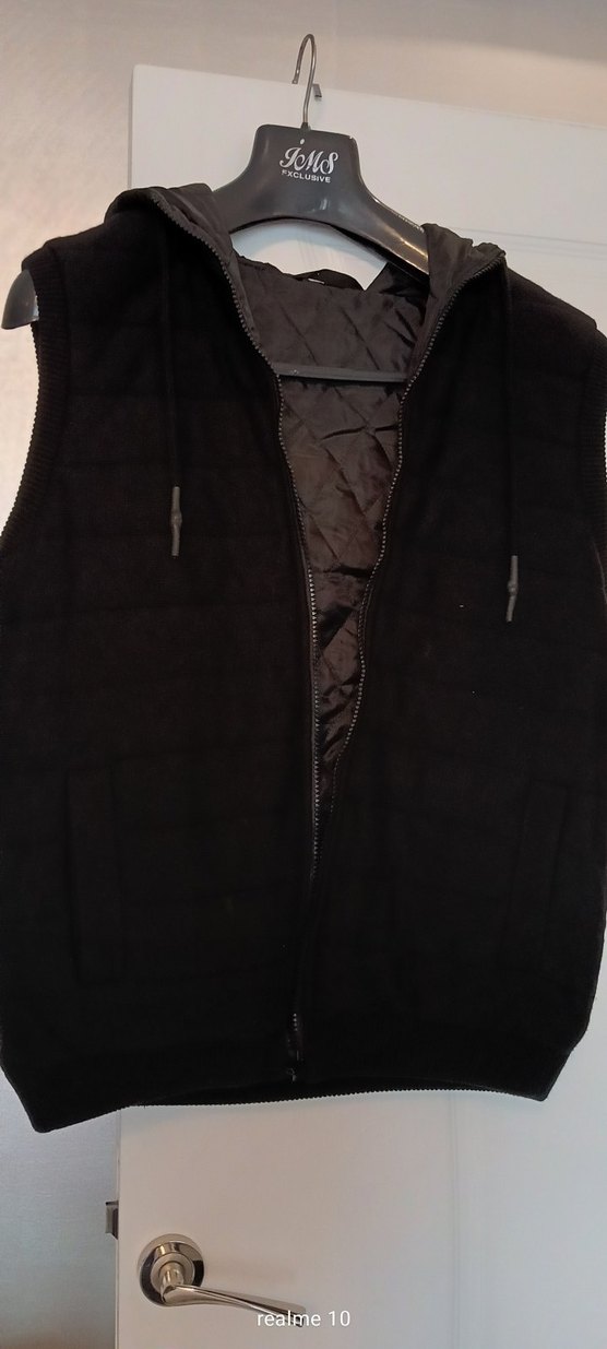 Siyah renkli, fermuarlı ve kapşonlu erkek yelek. içi astarlı dışı triko yelek