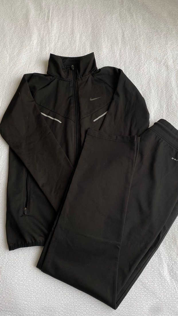 Fermuarlı cepler ve yüksek yakalı, siyah renkte düz eşofman takımı. Sokak stili için uygun, sentetik kumaştan üretilmiştir.