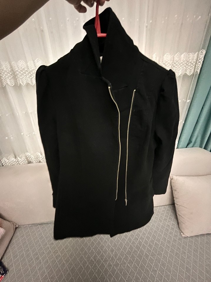 Siyah renkli, fermuarlı önü ve yüksek yakası olan, uzun kollu, normal boy midi hamile montudur. Yumuşak ve sıcak kumaştan yapılmıştır, günlük sokak stiline uygundur.