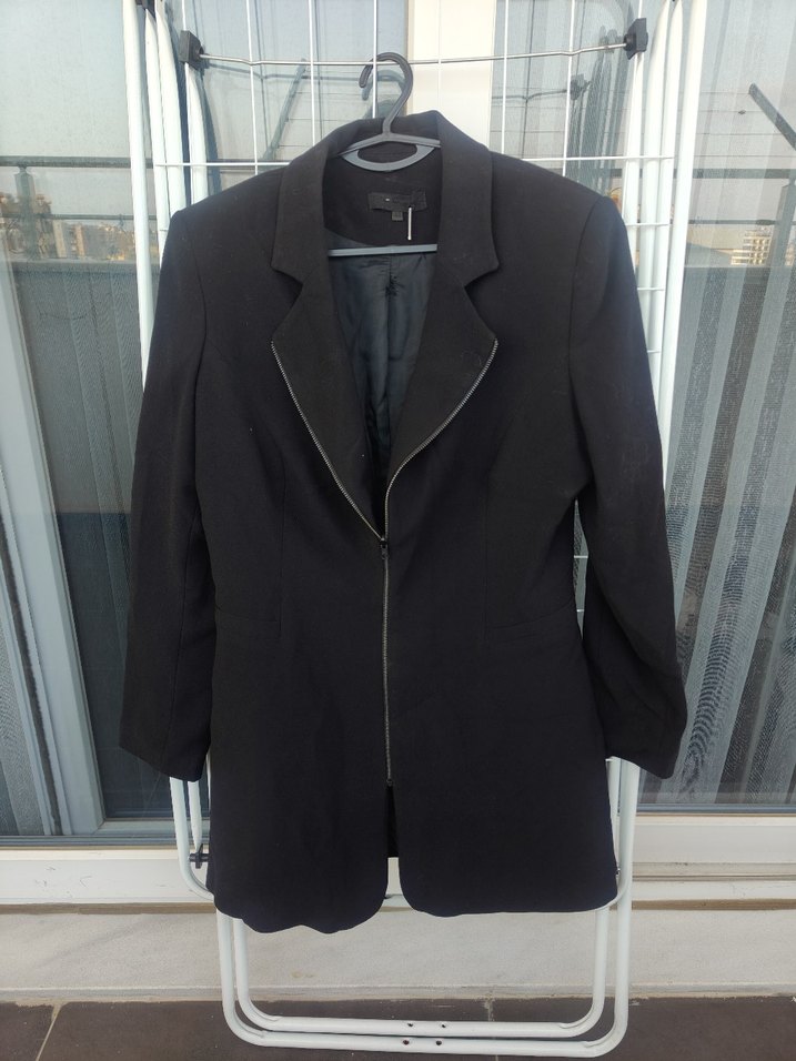 Siyah, fermuarlı, notched yakalı kadın blazer. Uzun kollu, regular fit ve sentetik kumaştan. Ofis ve sokak stiline uygun.
