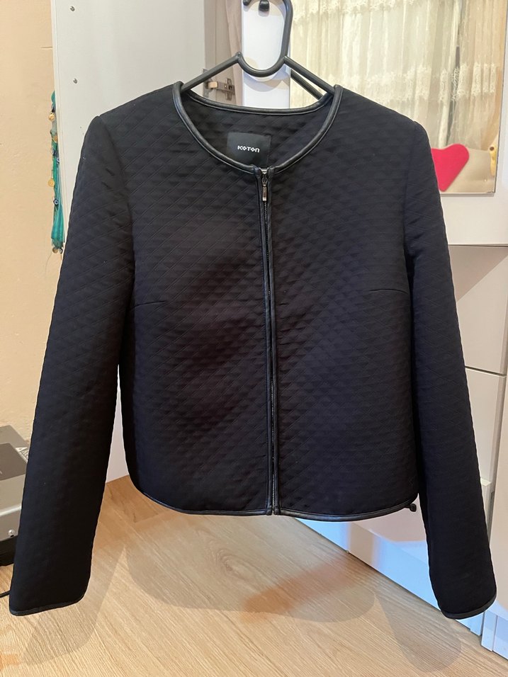 Bu siyah kadın ceketi, fermuarlı ön ve uzun kolludur. Normal kesim ve yakası notched lapel olup, sentetik kumaştan üretilmiştir. Ofis kullanımı için uygundur.