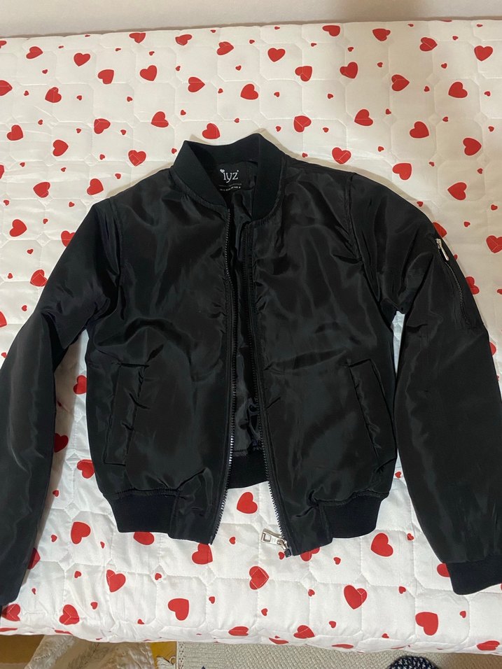 Düz siyah, fermuarlı, uzun kollu, bisiklet yaka ve ince kesim kadın ceket. Sentetik kumaştan üretilmiş, minimal tarzda, romantik akşamlar için uygun. Hiç giymedim crop model
