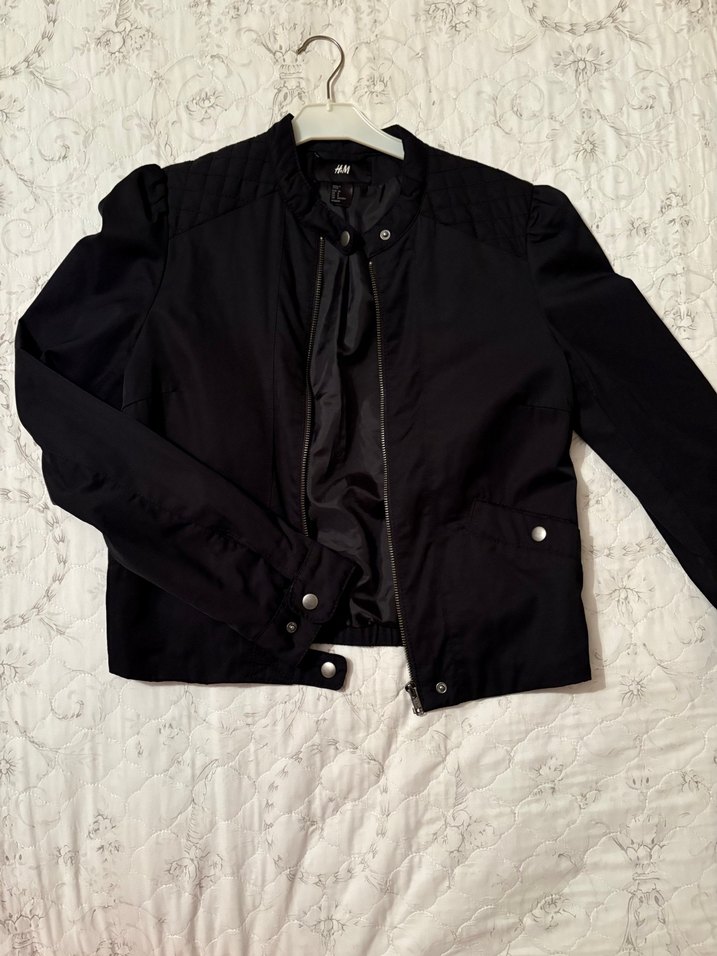 Fermuarlı ve çıtçıtlı detaylara sahip, siyah, uzun kollu, oturmalı kadın ceketi. Sentetik kumaştan yapılmıştır, günlük kullanım için uygundur.