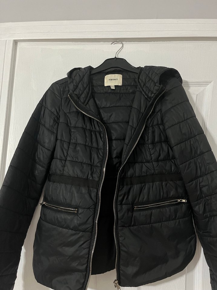 Fermuarlı, siyah ve normal midi uzunlukta kadın ceket. Sentetik kumaştan, kapitone detaylı ve minimal tarzda günlük kullanım için uygun.