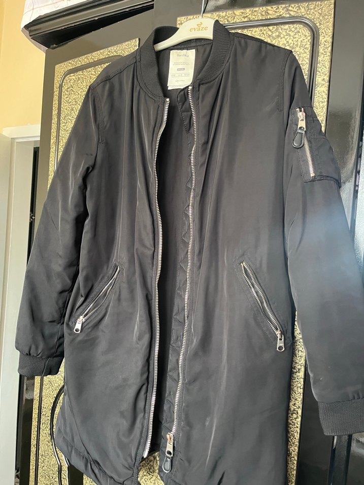 Siyah renkte, fermuarlı ön ve ceplere sahip uzun kollu, bol kesim kadın ceket. Sentetik kumaştan üretilmiş, günlük kullanıma uygun sokak tarzı midi ceket.