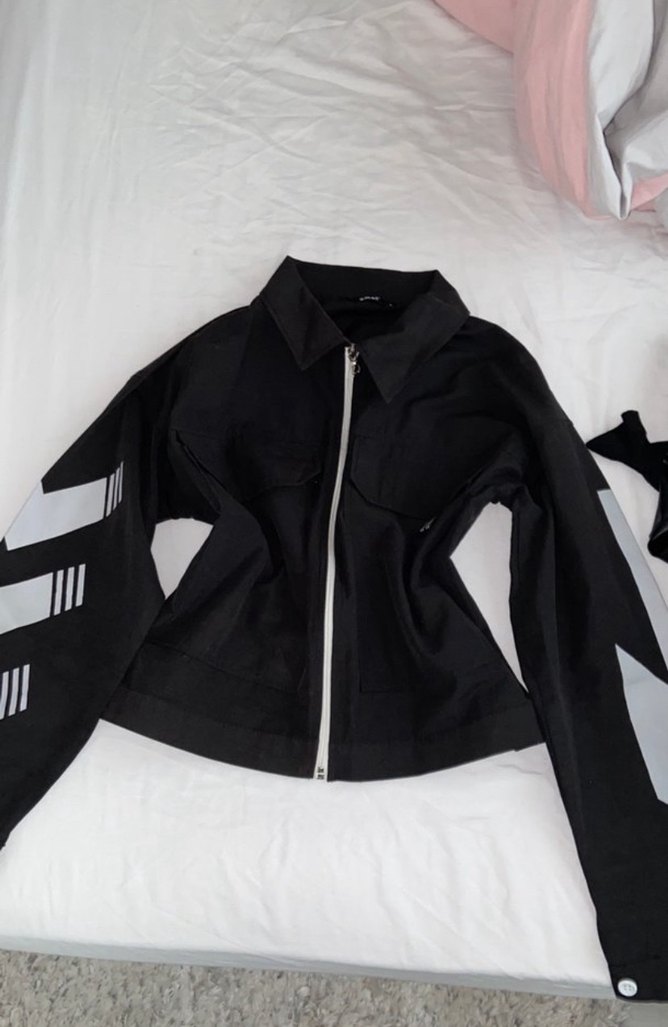 Bu siyah, fermuarlı kadın gömlek ceket, uzun kollu ve beyaz çizgili detaylara sahip. Sentetik kumaştan yapılmış, midi boyda ve yakalıdır. Günlük kullanıma uygun.
