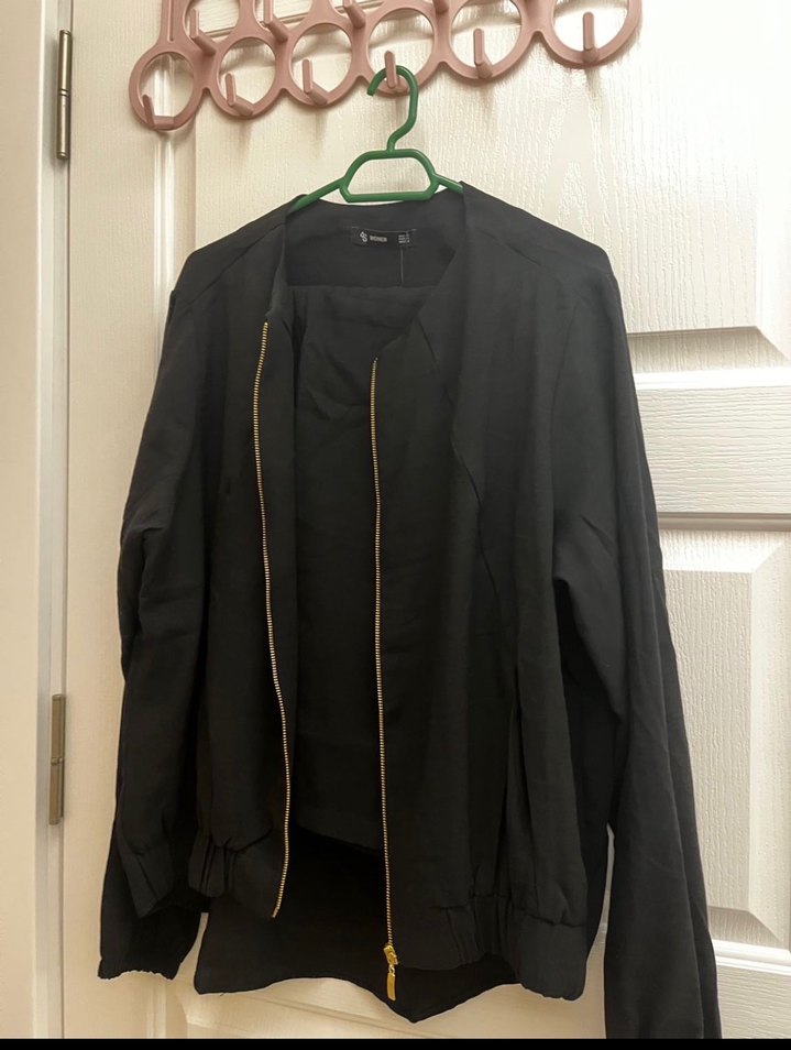 Siyah renkli, fermuarlı ve yakası kesik detaylı kadın ceketi. Uzun kollu ve düz kesim, sentetik kumaştan üretilmiştir. Ofis için uygun minimalist tarza sahiptir pantolonu havuç kesimdir beli lastiklidir ceketin arkası hafif uzundur kemerde bitiyor ön kısmının boyu gold fermuar detayı . Keten kumaştır hiç giyilmedi yeni etiketlidir