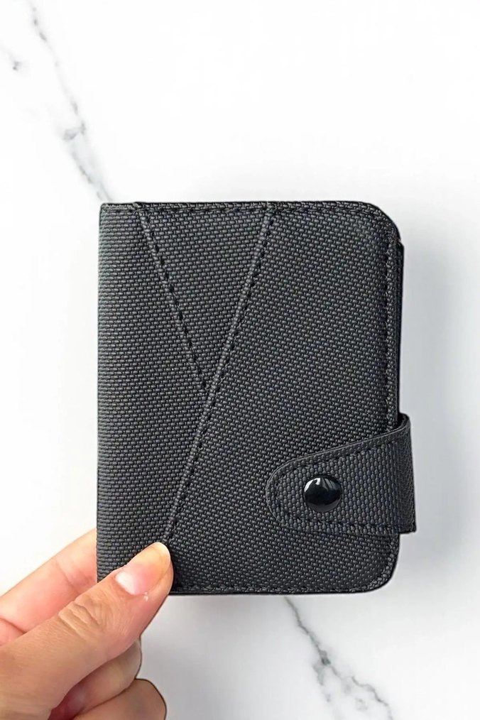 Dayanıklı sentetik kumaştan yapılmış siyah kadın cüzdanı, fermuarlı ve çıtçıtlı kapama özelliğine sahiptir. Günlük kullanım için uygundur, desensiz ve sade tasarımlıdır.