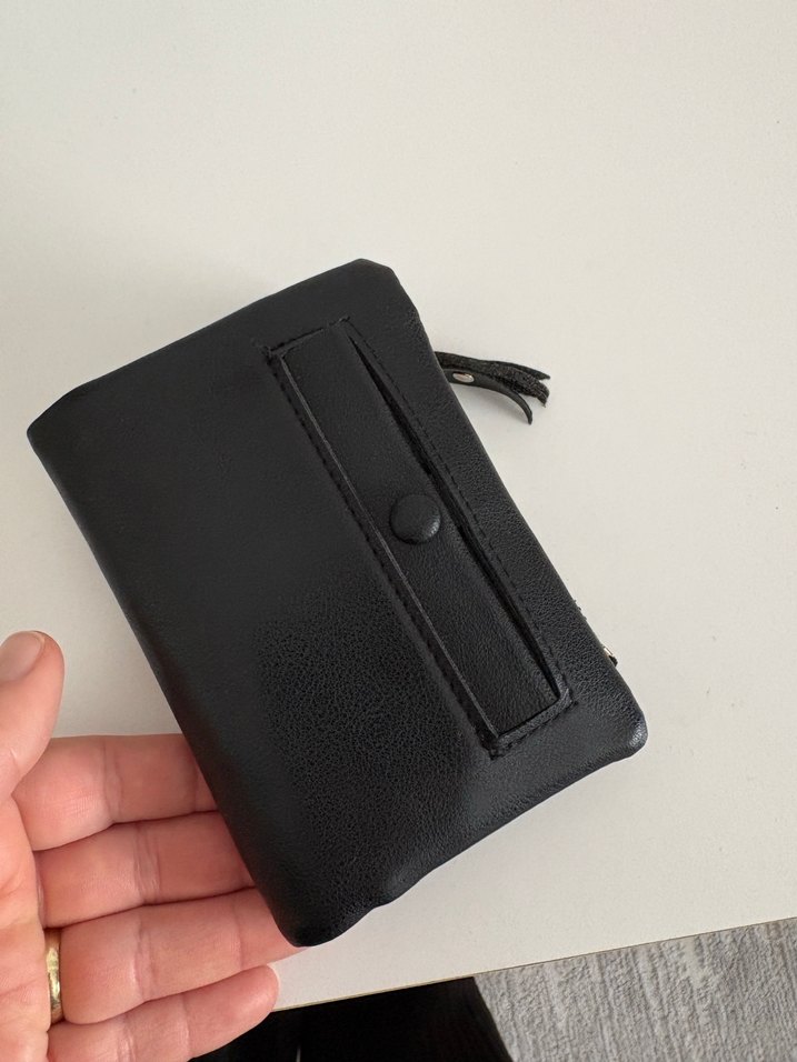 siyah kadın cüzdanı, fermuarlı kapanışa ve sade, desensiz tasarıma sahiptir.resimler günceldir.kullanıma engel bir durumu yoktur