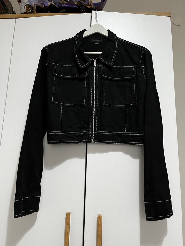 Fermuarlı, uzun kollu, siyah fitted denim ceket. Notlu yaka ve ön cep detaylarıyla sokak stiline uygun.