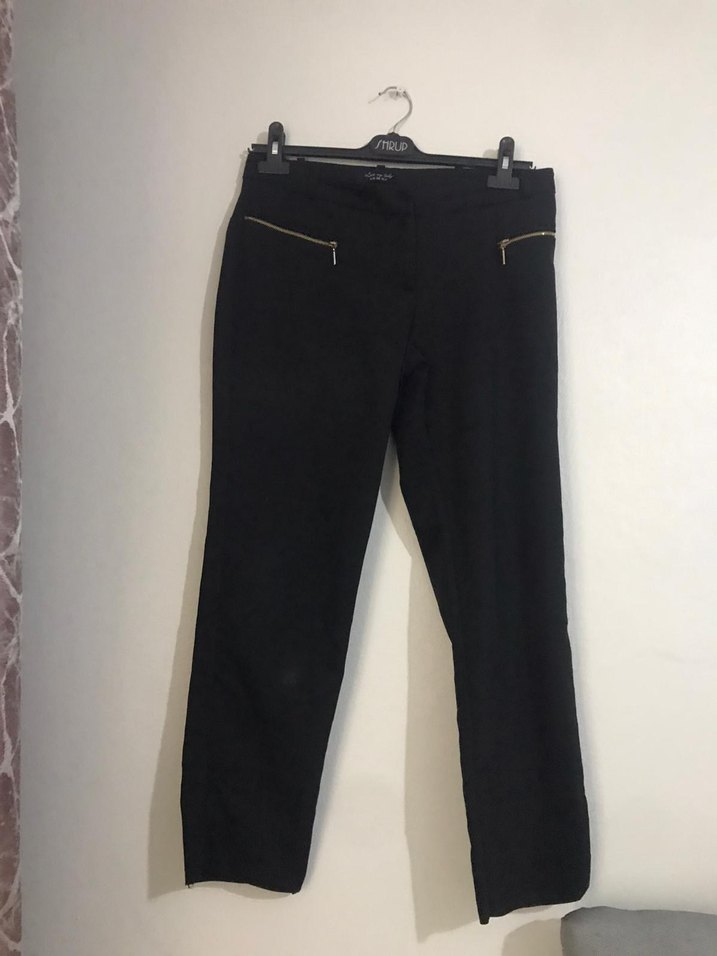 Siyah denim kumaştan, normal boy ve fermuarlı ceplere sahip, rahat kesim kadın pantolon. Ofis ve günlük kullanıma uygun.