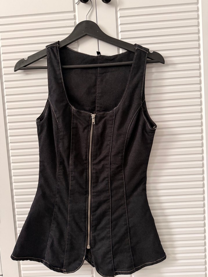 Siyah denim kumaştan, fermuarlı ve V yakalı, kolsuz, dar kesim kadın yelek. Günlük kullanıma uygun gotik tarzda.