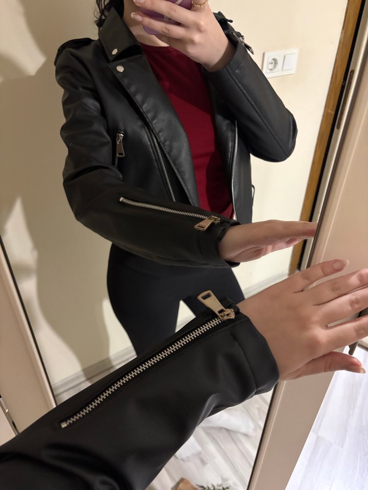 Fermuarlı detaylara sahip, siyah, dar kesim deri biker ceket. Notlu yaka ve askılı kollu, normal midi boyda, günlük kullanım için uygun.
