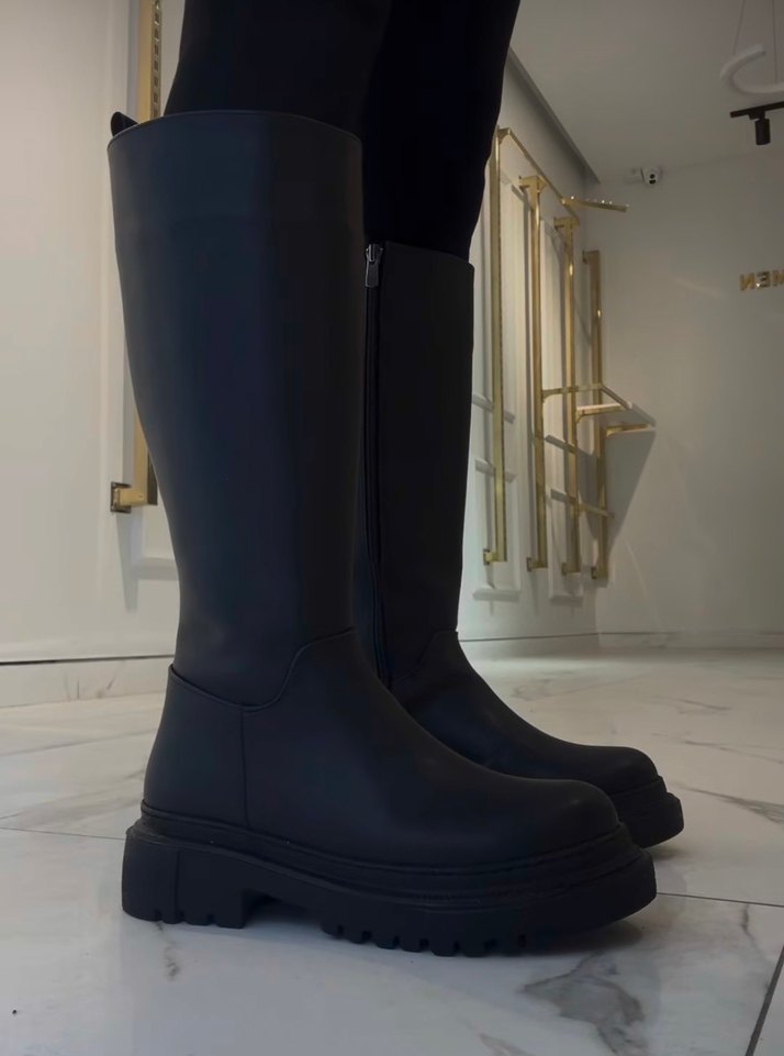 Siyah, kauçuk malzemeden yapılmış, blok topuklu ve yan fermuarlı dizüstü bot. Günlük kullanıma uygun goth tarzı.