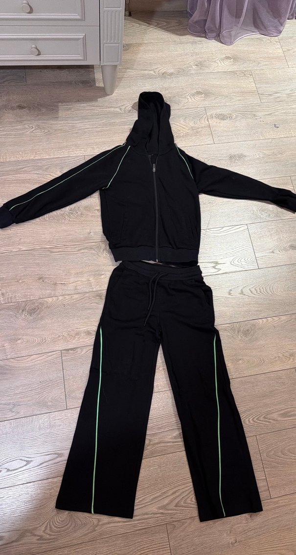 Siyah, fermuarlı ve uzun kollu kadın eşofman takımı, yüksek yakalı ve vücuda oturan kesimdedir. Yumuşak ve sıcak kumaştan, yanları ince şerit detaylıdır.