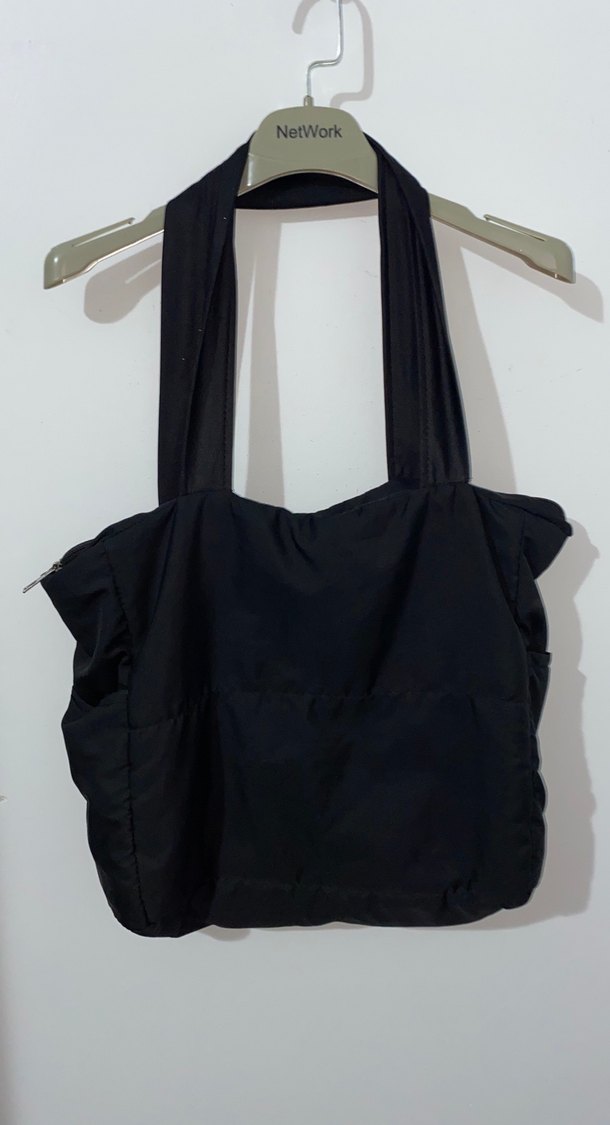 Siyah renkli, fermuarlı ve sentetik kumaştan üretilmiş kadın günlük çanta. Street wear ve athleisure tarzlarına uygundur.