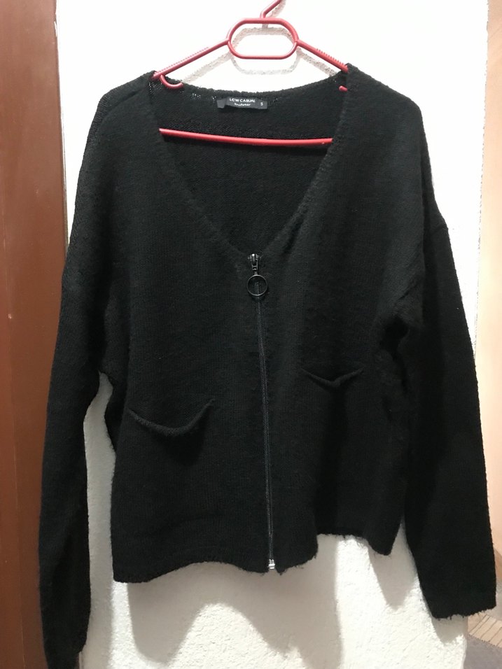 Siyah fermuarlı hırka, bol kesim ve uzun kolludur. Yumuşak ve sıcak kumaştan yapılmış, V yaka ve iki ön cepli günlük kullanıma uygundur.