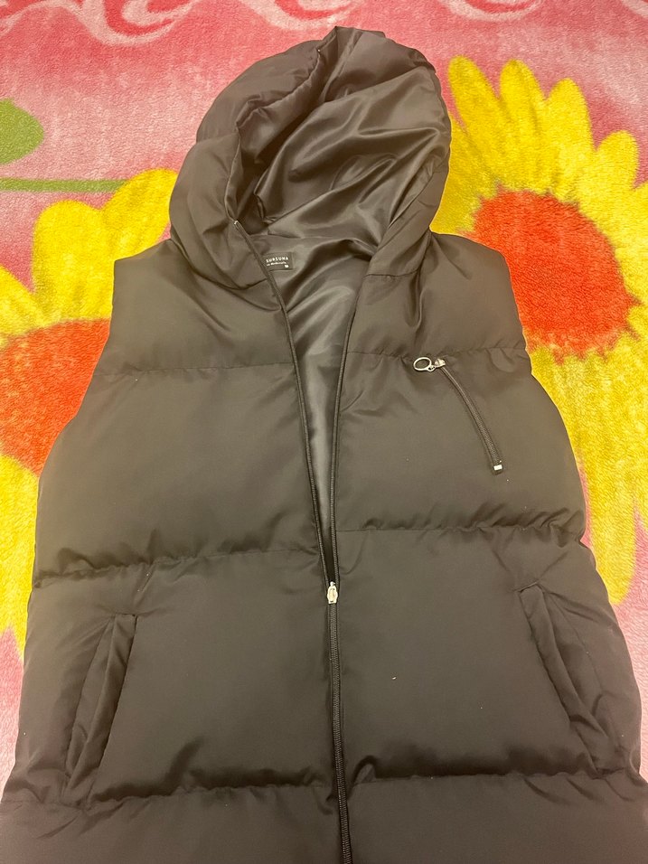 Siyah renkte, fermuarlı, kapüşonlu ve yüksek yakalı kadife dokulu yelek. Cepli ve vücuda oturan kesimiyle rahat ve şık bir seçenek.