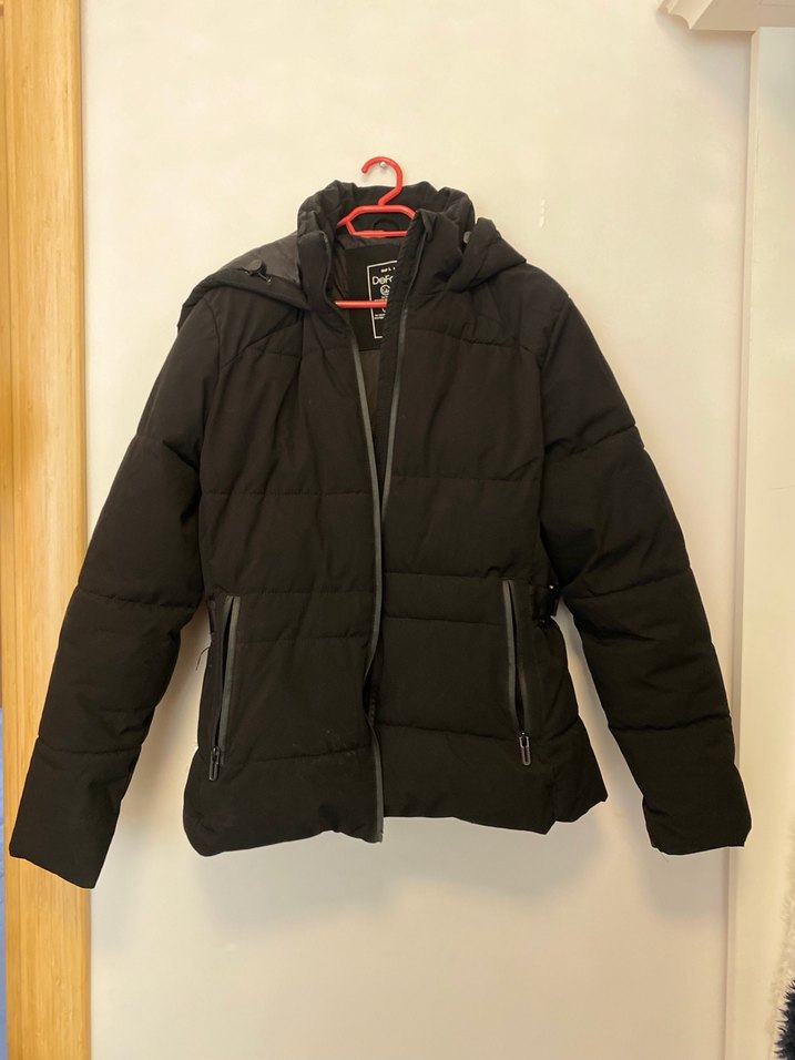 Siyah, fermuarlı, uzun kollu, kesimi dar kadın kış montu. Yumuşak ve sıcak kumaştan, notched lapel yakalı, dış mekan kullanımı için uygun.