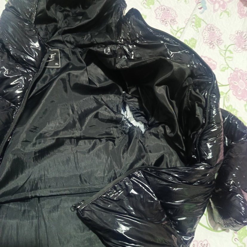 Fermuarlı ve boğazlı, parlak plastikten yapılmış, sokak stiline uygun, dar kesim siyah kadın kışlık cekettir.