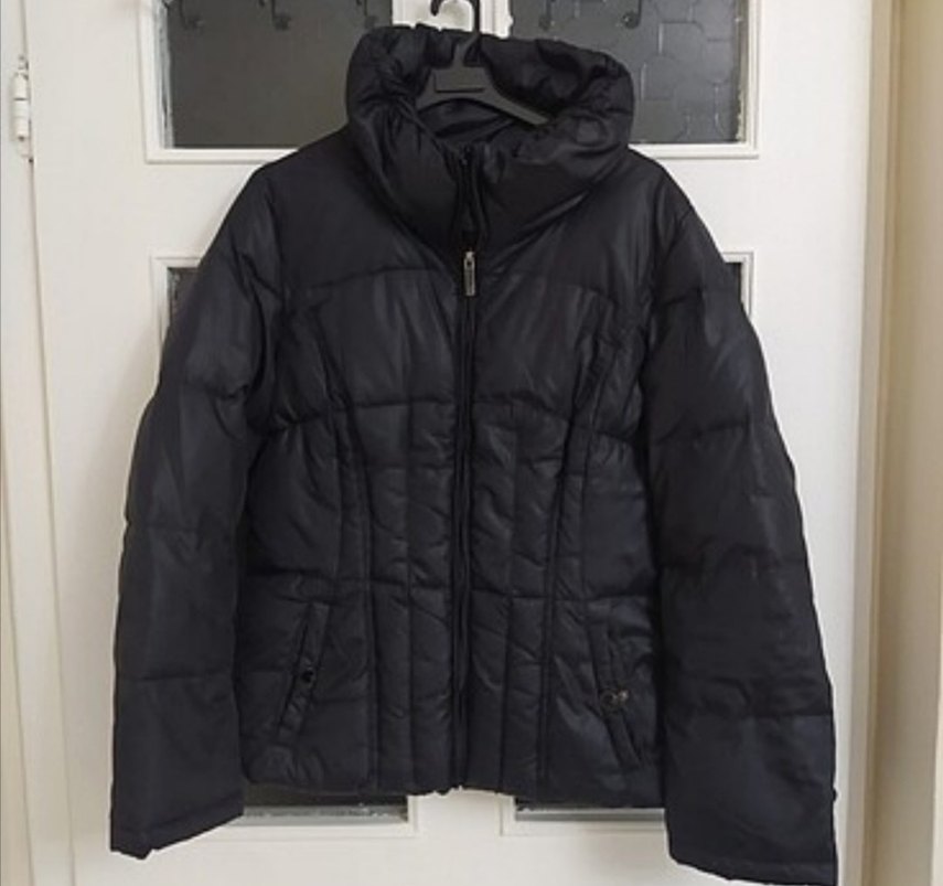 Siyah renk, fermuarlı ve notched lapel yakalı kadın kışlık mont. Sentetik kumaştan, midi boyda ve fitted kesim. Sokak stili ve dış mekan kullanımı için uygun.
