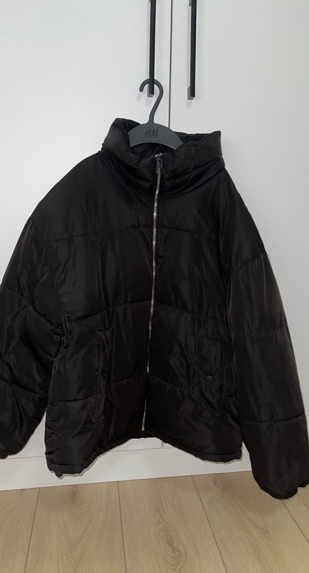 Yumuşak ve sıcak polarla yapılmış, fermuarlı ve yüksek yakalı siyah kışlık ceket. Gevşek kesim, normal boyda, günlük kullanıma uygun.