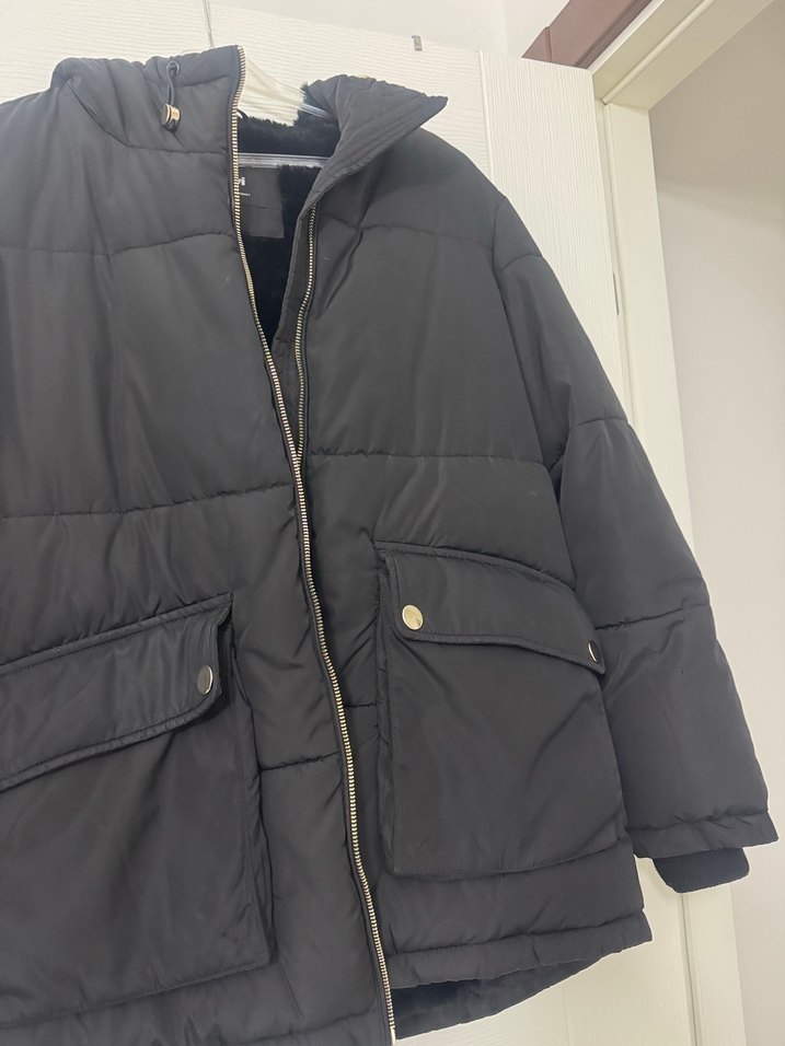 Siyah renkli, fermuarlı ve normal boyda kadın kışlık mont. Yumuşak kumaştan, yaka detayı ve askılı kollara sahip, günlük kullanıma uygun. 36 beden yazıyor fakat 38-40 beden için de olabilir.Kalıbı geniş