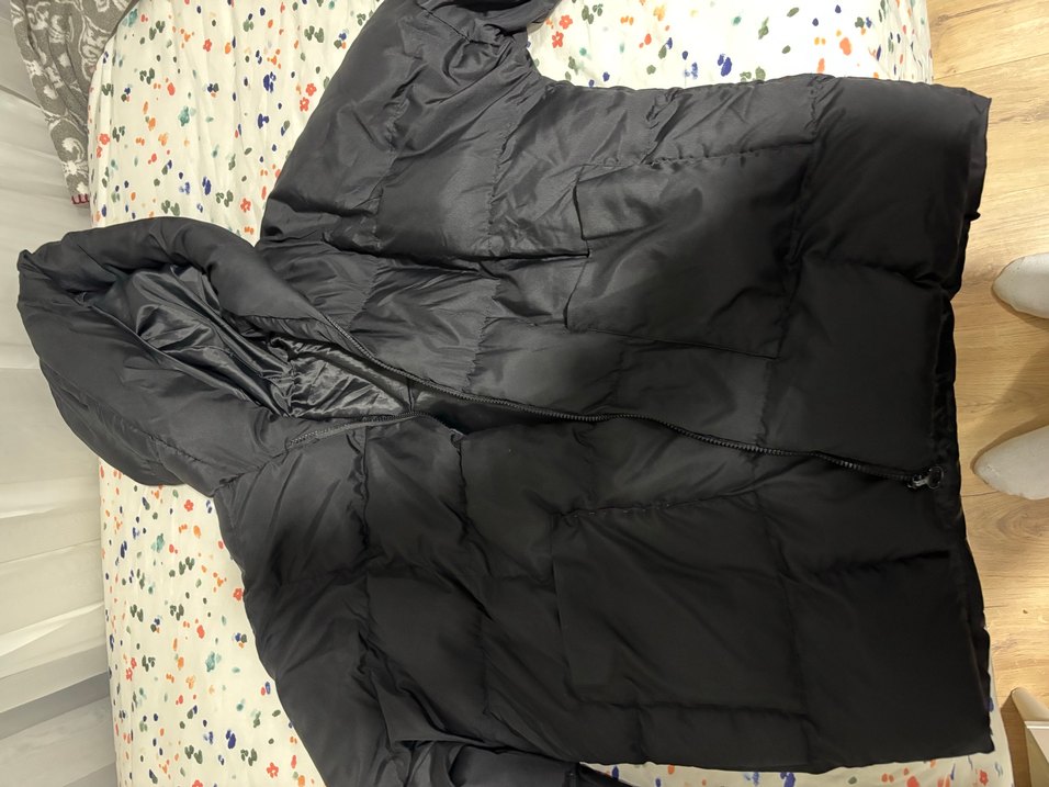 Yumuşak sentetik kumaştan yapılmış, fermuarlı ve yüksek yakalı, uzun kollu siyah, kışlık mont. Normal midi boyda, gündelik sokak stili için uygundur. Oversize bir mont cep kısmında bir yırtık vardı o dikilmiş fotoğrafta da belirttim.