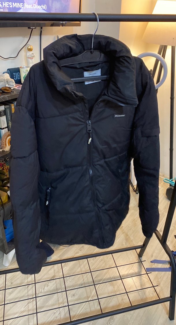Siyah, fermuarlı ve yüksek yakalı erkek kışlık mont, uzun kollu ve vücuda oturan kesime sahiptir. Yumuşak ve sıcak kumaştan yapılmış, günlük kullanım için uygundur. Tek sıkıntısı fermuar kısmındaki kumaşın yırtılmış olması bu yüzden açılıp kapanması zor oluyor ancak giyecek kişi terziye götürüp yaptırırsa kullanılmaya devam edilebilir.