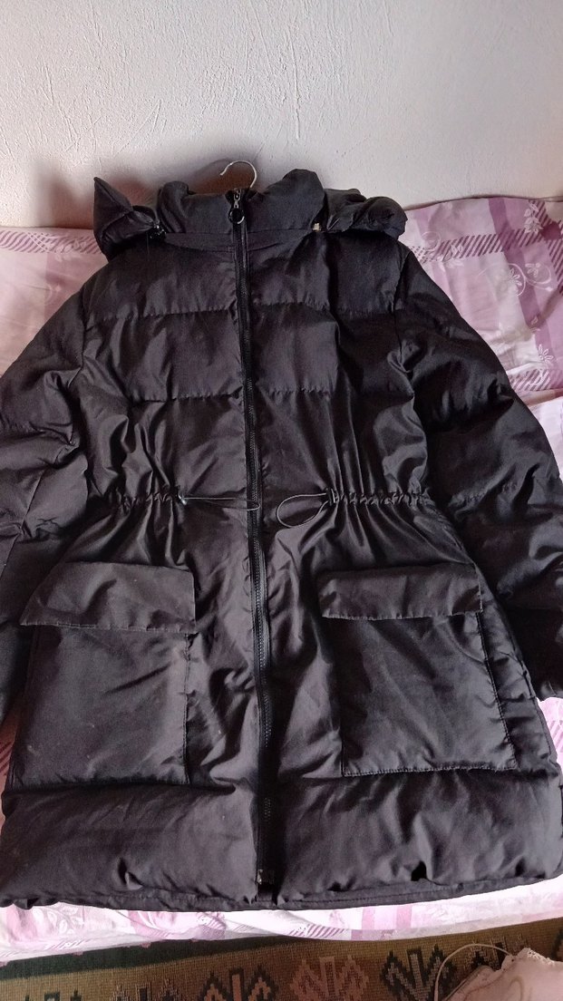 Siyah renkli, fermuarlı ve büyük cepli kadın kışlık mont. Notlu yaka ve askılı kollara sahip, yumuşak ve sıcak kumaştan üretilmiş, günlük sokak stiline uygun. Boy 91 kol 56 2 kol arası 50 cm Makinada yıkandı için bazı kısımlarında elyafinda toplanma var ama iyi duzeltilebilir.