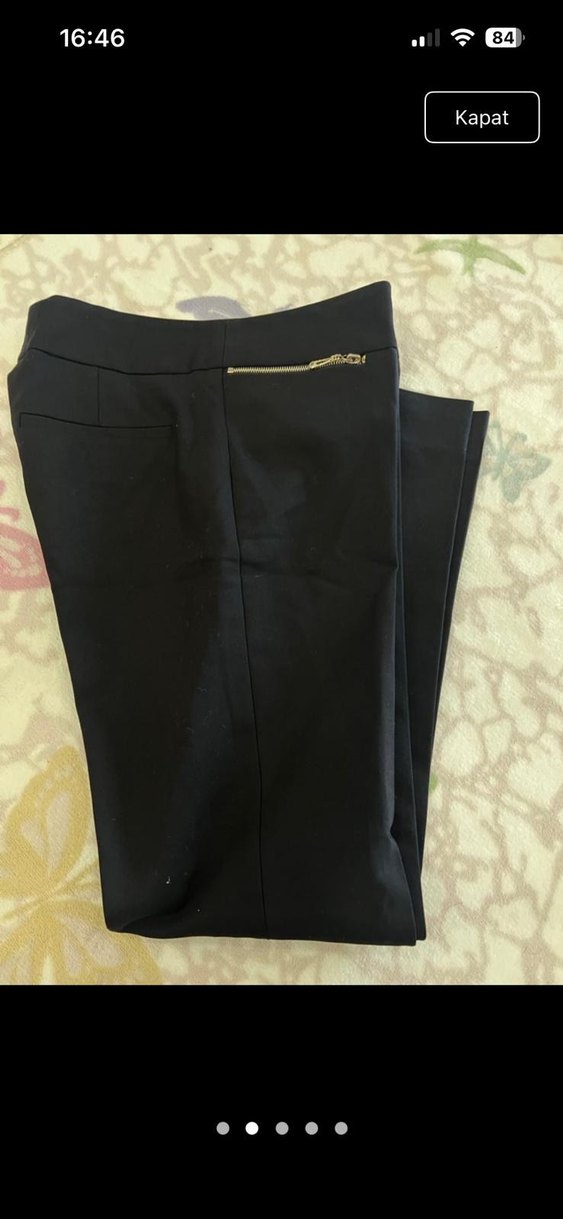 Siyah, fermuarlı ve normal boy midi kumaş pantolon. Sentetik kumaştan, ofis ve günlük şıklık için uygun, rahat kesim.