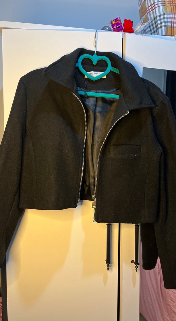 Fermuarlı ön cepheli, uzun kollu, siyah midi boy, fitted kesim kadın ceket. Ofis kullanımı için uygundur.