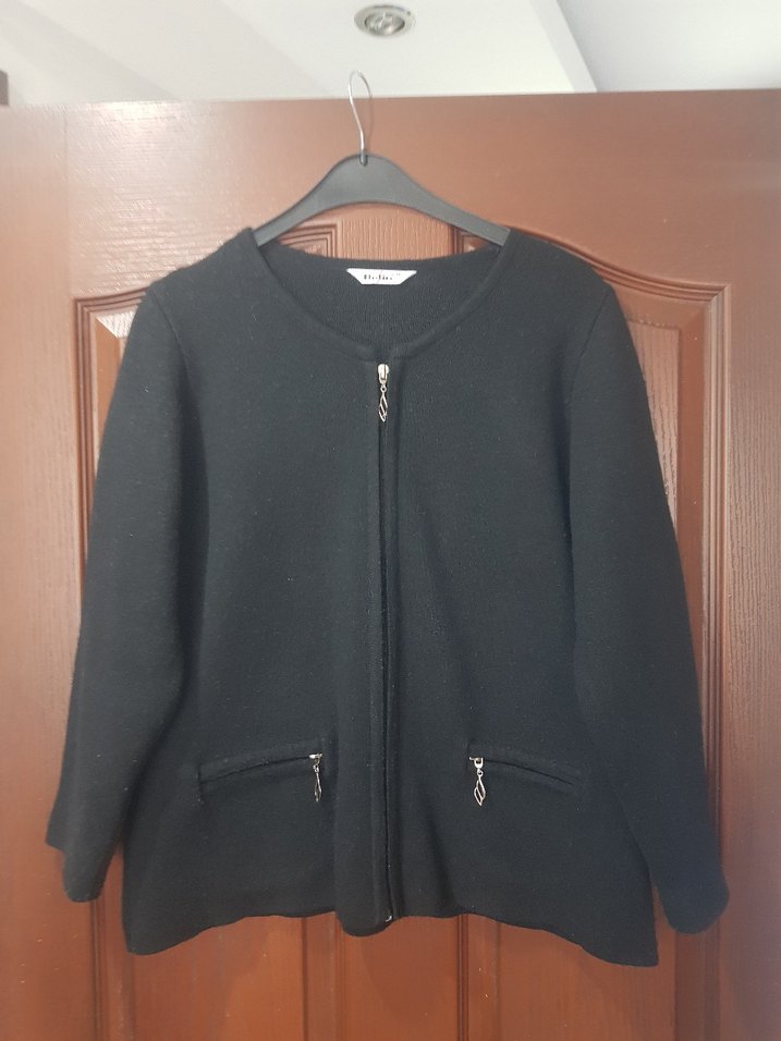 Siyah midi ceket, fermuarlı ön ve ceplere sahip. Uzun kollu, bol kesim ve yumuşak, sıcak kumaştan üretilmiştir. Yuvarlak yakalı, sade tasarımlıdır.