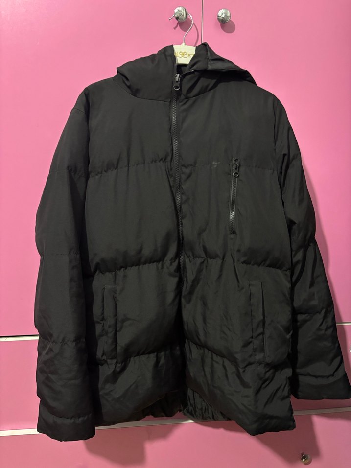 Siyah, fermuarlı, yüksek yakalı, uzun kollu kadın kış montu. Yumuşak ve sıcak kumaştan, günlük kullanıma uygun, dar kesim midi boy.