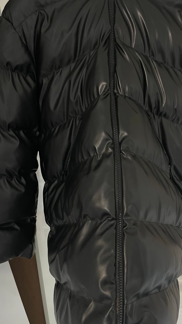 Fermuarlı, yüksek yakalı ve sentetik kumaştan yapılmış siyah, fitted kadın midi kışlık kaban. Strappy kollu ve street wear tarzında, günlük kullanıma uygun.