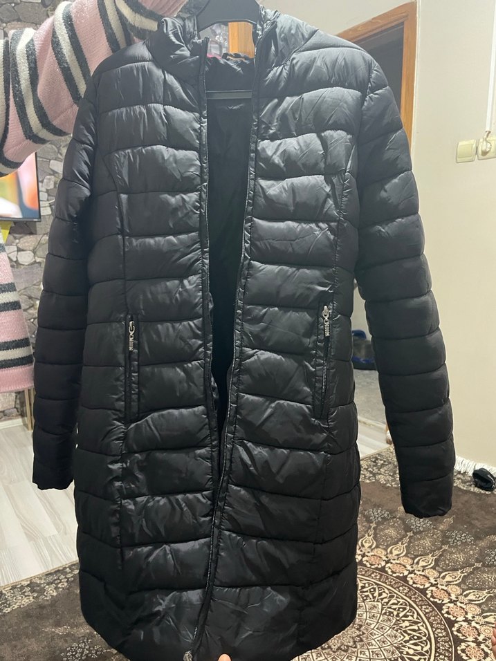 Fermuarlı cepleri ve kesimli yapısıyla siyah midi uzunlukta kadın kışlık mont. Yumuşak sentetik kumaştan, uzun kollu ve günlük sokak stili için uygun. Hiç giyilmedi 45 50 kiloya kadar olur