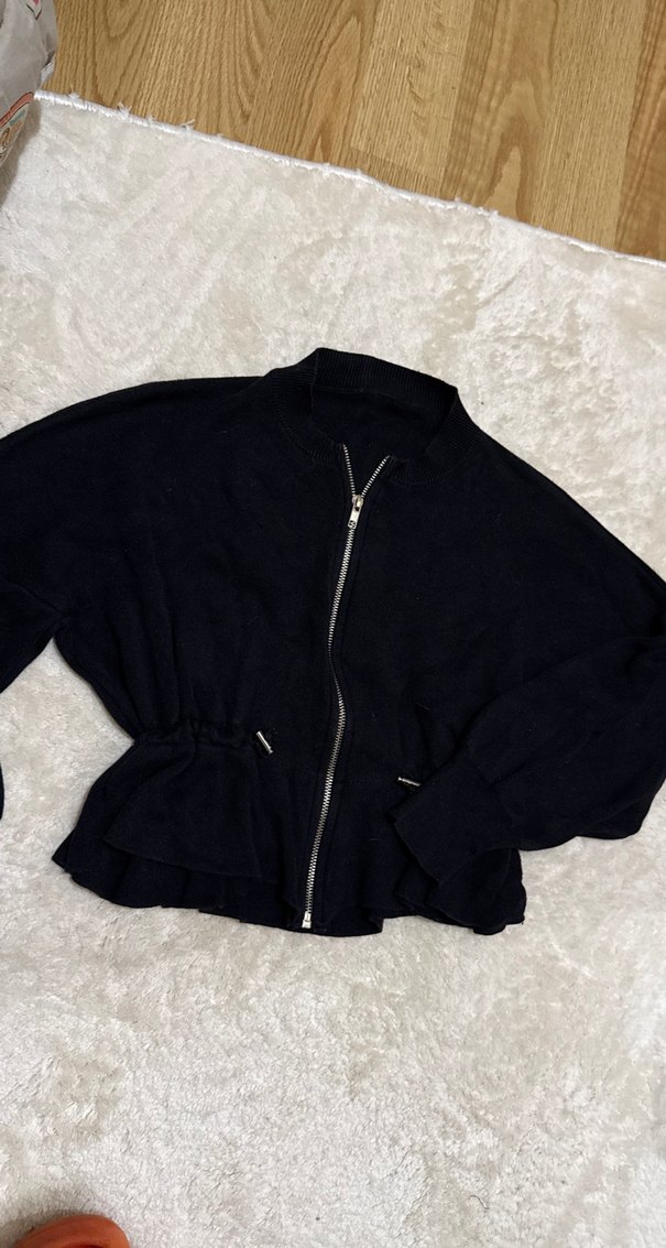 Siyah, kısa boylu ceket yüksek yakalı ve fermuarlı. Bol kesim, uzun kollu, yumuşak ve sıcak kumaştan, rahat sokak giyimi için uygun.