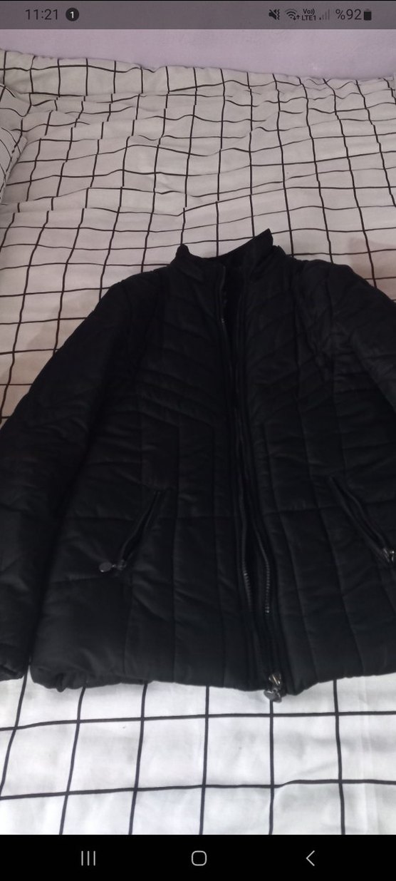 Fermuarlı, yüksek yakalı ve normal boyda siyah, rahat dokulu, sade tasarımlı kadın mont. Günlük kullanım için uygundur.
