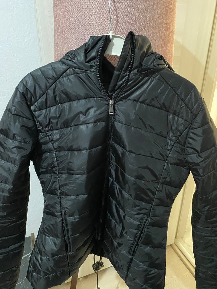 Siyah renkli, fermuarlı ve yüksek yakalı kadın mont. Sentetik kumaştan, rahat ve sokak tarzı için uygun, günlük kullanıma ideal.