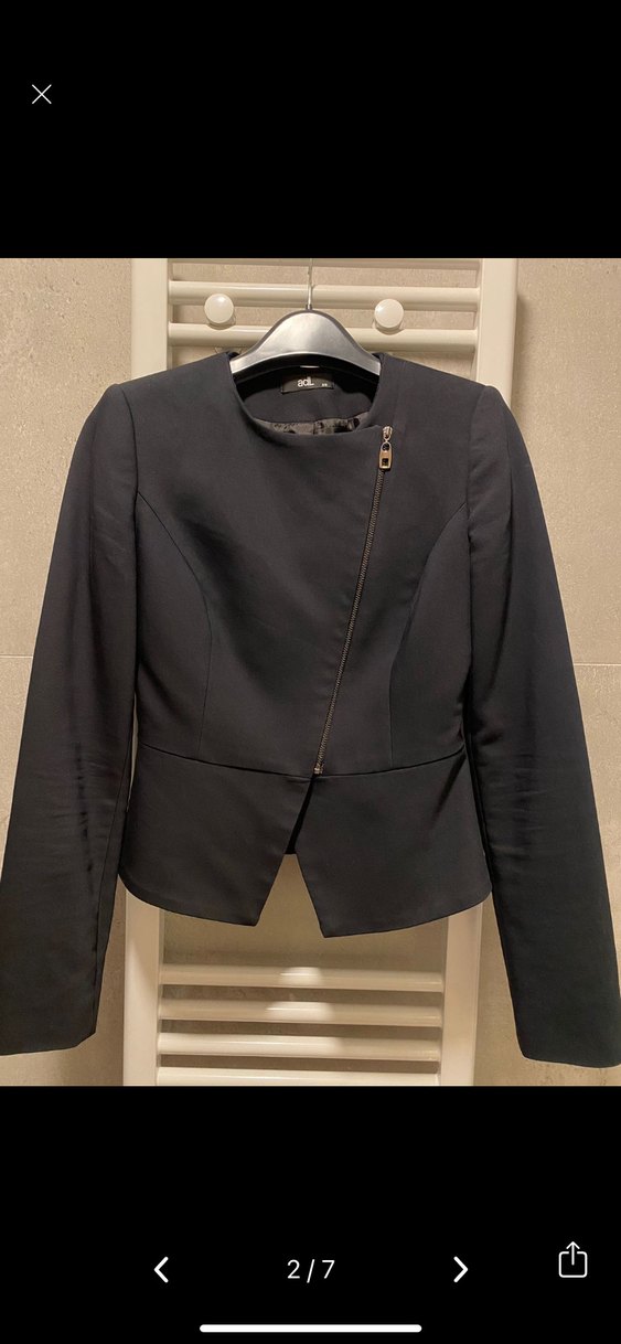 Siyah renkli, uzun kollu ve fermuarlı ön kapamalı kadın blazer. Normal kesim ve midi boyda, düz sentetik kumaştan üretilmiş, ofis ve sokak stiline uygun.